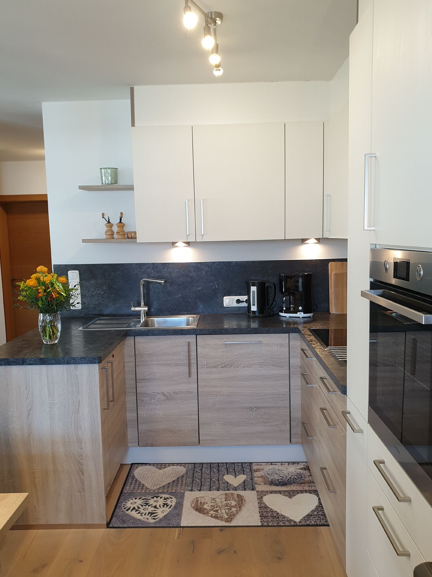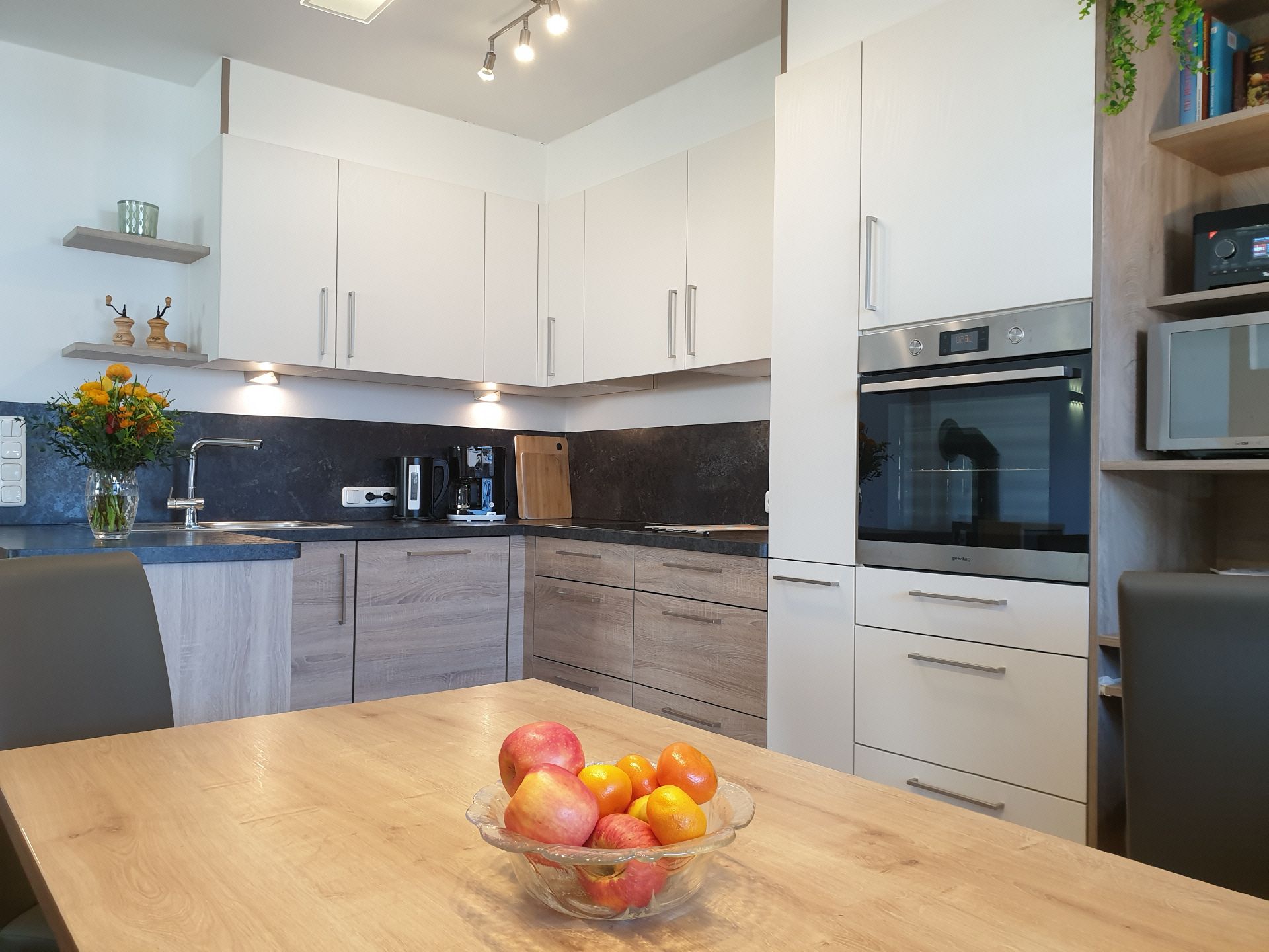 Die Küche ist komplett mit Induktionsherd, Mikrowelle in Kombination mit Umluftbackofen und Grill, einem Backofen, einer Geschirrspülmaschine, einer Kühl-Gefrierkombination sowie einer Kaffeemaschine, einem Wasserkocher, Toaster etc. ausgestattet. Hochwertiges Geschirr und Töpfe sowie sonstige Küchenutensilien sind entsprechend vorhanden.
