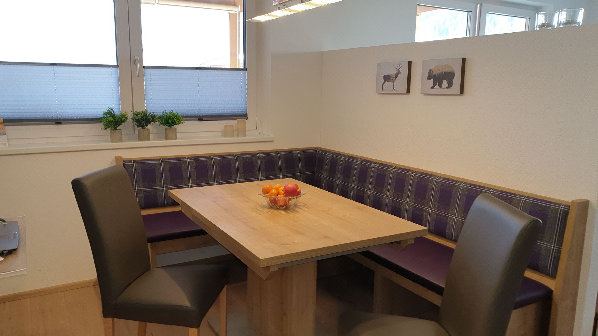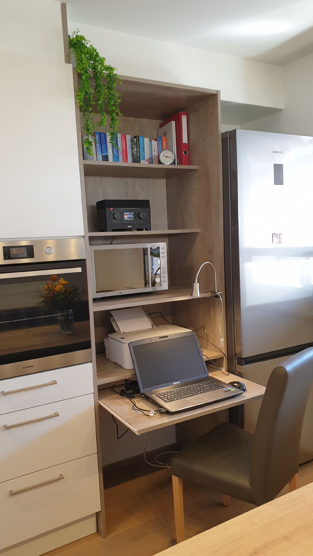 Die Küche mit großem Tisch und Eckbank, mit Stühlen sowie PC-Arbeitsplatz und der Wohnraum sind zum Süd-Westen hin ausgerichtet, wobei der Wohnraum durch eine kleine Trennwand vom übrigen Raum abgeteilt ist.